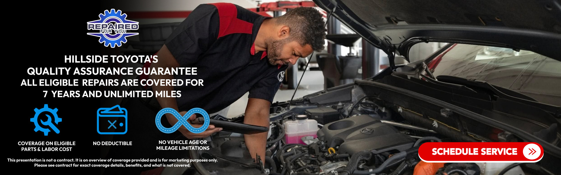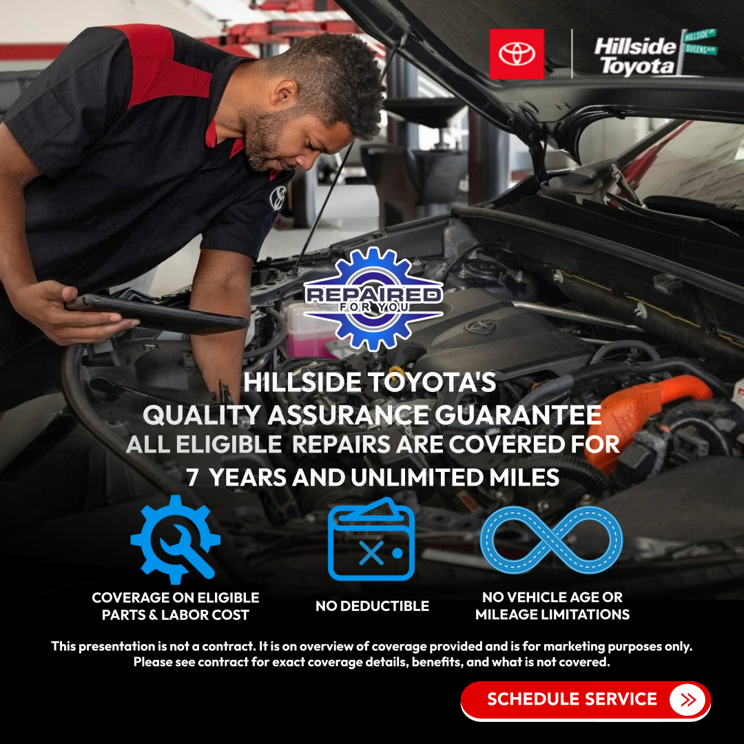 At Hillside Toyota, we’re dedicated to delivering the highest level of quality and peace of mind. That’s why every eligible repair is backed by our 7-Year / Unlimited-Mile Repair Guarantee—at no extra cost to you. This isn’t an insurance policy you have to purchase; it’s a promise that comes standard with your qualifying service.
